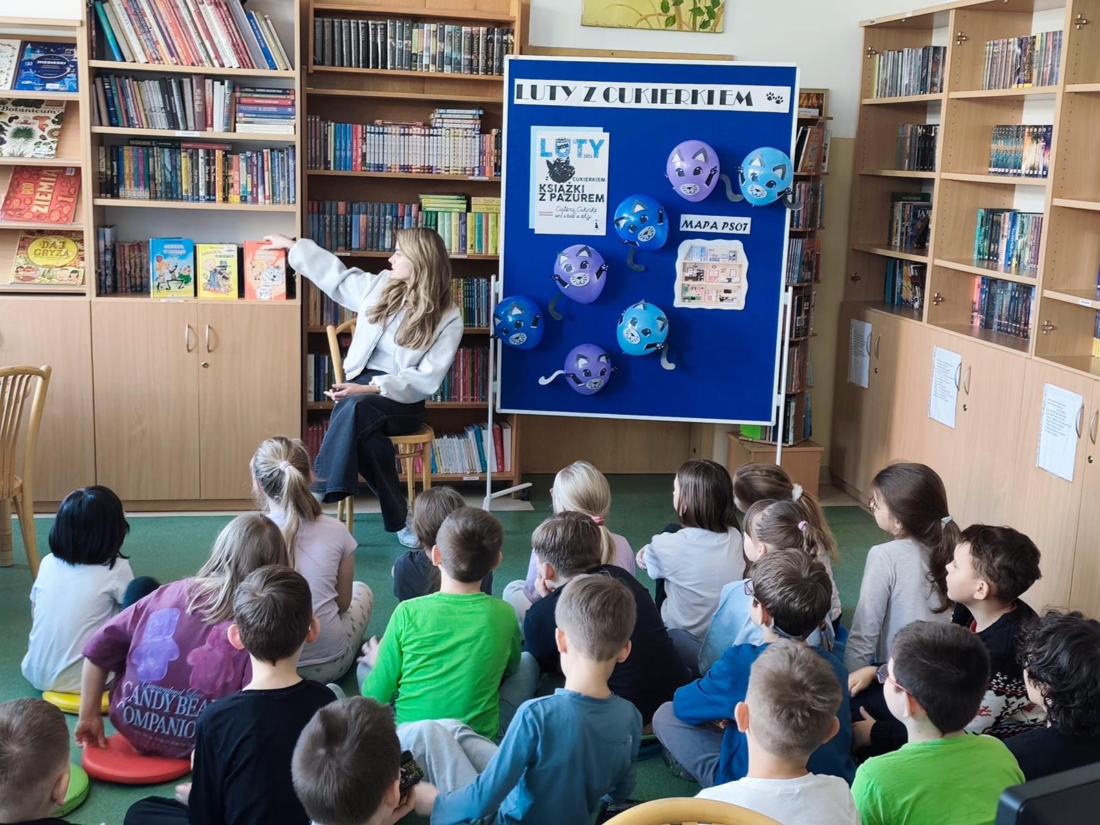 Podczas wspólnego czytania fragmentów serii o kocie Cukierku, dzieci aktywnie uczestniczyły w zajęciach, reagując na umówione hasła i słuchając z ogromnym skupieniem. Rozmawialiśmy o przygodach sympatycznego, pełnego energii bohatera oraz o tym, dlaczego warto sięgać po książki z tej serii.